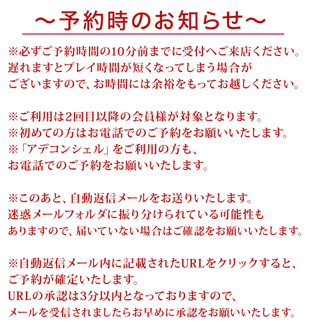 ・女性の体調により、キャンセルやお時間のズレとなる場合もございますのでご了承ください。