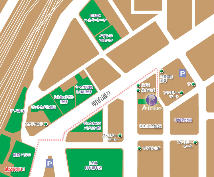 池袋東口から徒歩3分です。駅周辺もしくはビックカメラパソコン館あたりからお電話下さい。詳しく道案内します。
